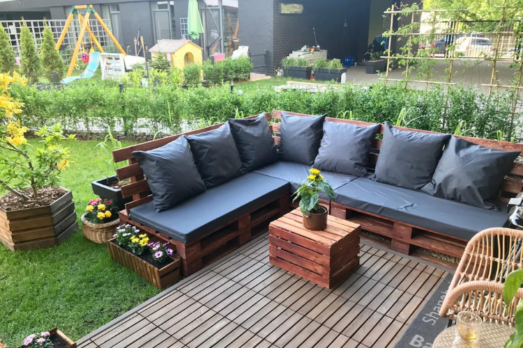 Narożnik ogrodowy z palet to połączenie ekologicznego designu z solidnym rzemiosłem. Wykonany z wysokiej jakości palet, każda deska jest starannie heblowana, suszona i fazowana, co gwarantuje gładką powierzchnię i bezpieczne krawędzie. Malowanie w wybranym kolorze dodaje elegancji i pozwala dopasować narożnik do indywidualnych upodobań.