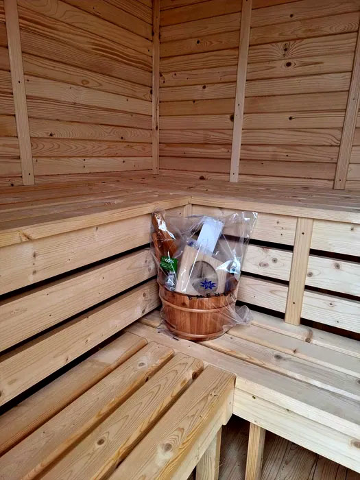 - Zestaw do saunowania – ceber, chochla, termo-higrometr, klepsydra – wszystko, co potrzebne do pełnej przyjemności.